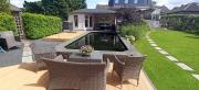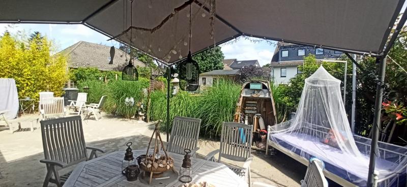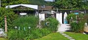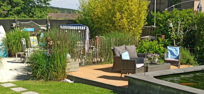 Größe des Gartens: ca. 650qmAls der Garten vor 9 Jahren angelegt wurde, ließen die Eigentümer erst einmal eine LKW Ladung voll feinstem Sand in der hintersten Ecke abkippen. Daraus entwickelte sich die Strandecke, bepflanzt mit Dünengras und bestückt mit Strandkorb und Strandhäuschen. Bei schlechtem Wetter kann man sich in einen Pavillon mit Blick auf den angrenzenden Koiteich zurückziehen. Verschiedene Sitzecken, eingefasst von Gräserbeeten lassen den Garten aus immer anderen Blickwinkeln erleben.