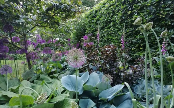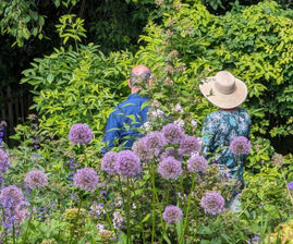 Das Gefälle wurde terrassiert und anstelle von Mauern mit üppig bepflanzen Hangbeeten abgefangen. Die unterschiedlichen Staudenkombinationen kennzeichnen die experimentierfreudige Gestaltung dieses Gartens. Eine überwiegend insektenfreundliche vielfältige Pflanzenauswahl spendet die ganze Saison über Nektar und Pollen für die Insektenwelt einschließlich einiger Bienenvölker.
