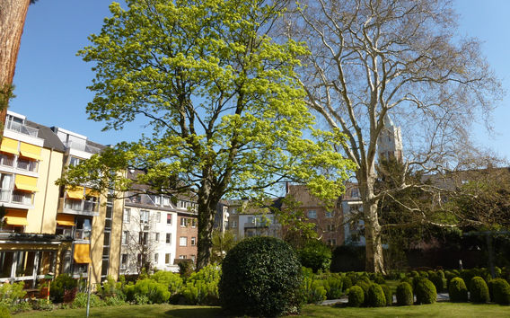 1894 wurde auf dem Gelände von Haus Aurelius das Evangelische Frauenheim gegründet. In dieser Zeit entstand auch der Garten, von dessen ursprünglicher Anlage noch mächtige Schatten spendende Bäume wie z.B. Mammutbaum, Linden, Platane, Blutbuche und viele mehr, Zeugnis ablegen. Glatt gepflasterte barrierefreie Wege erschließen den großzügig bepflanzten Park bis in den letzten Winkel. Vogelgezwitscher, das plätschern eines Bachlaufs, duftende Kräuter am Wegesrand, üppig bepflanzte Staudenbeete, eine kleine Obstwiese und immer mal wieder der Blick auf´s Marschiertor oder die St. Marienkirche lassen einen zur Ruhe kommen. Eine Oase mitten in der Stadt.